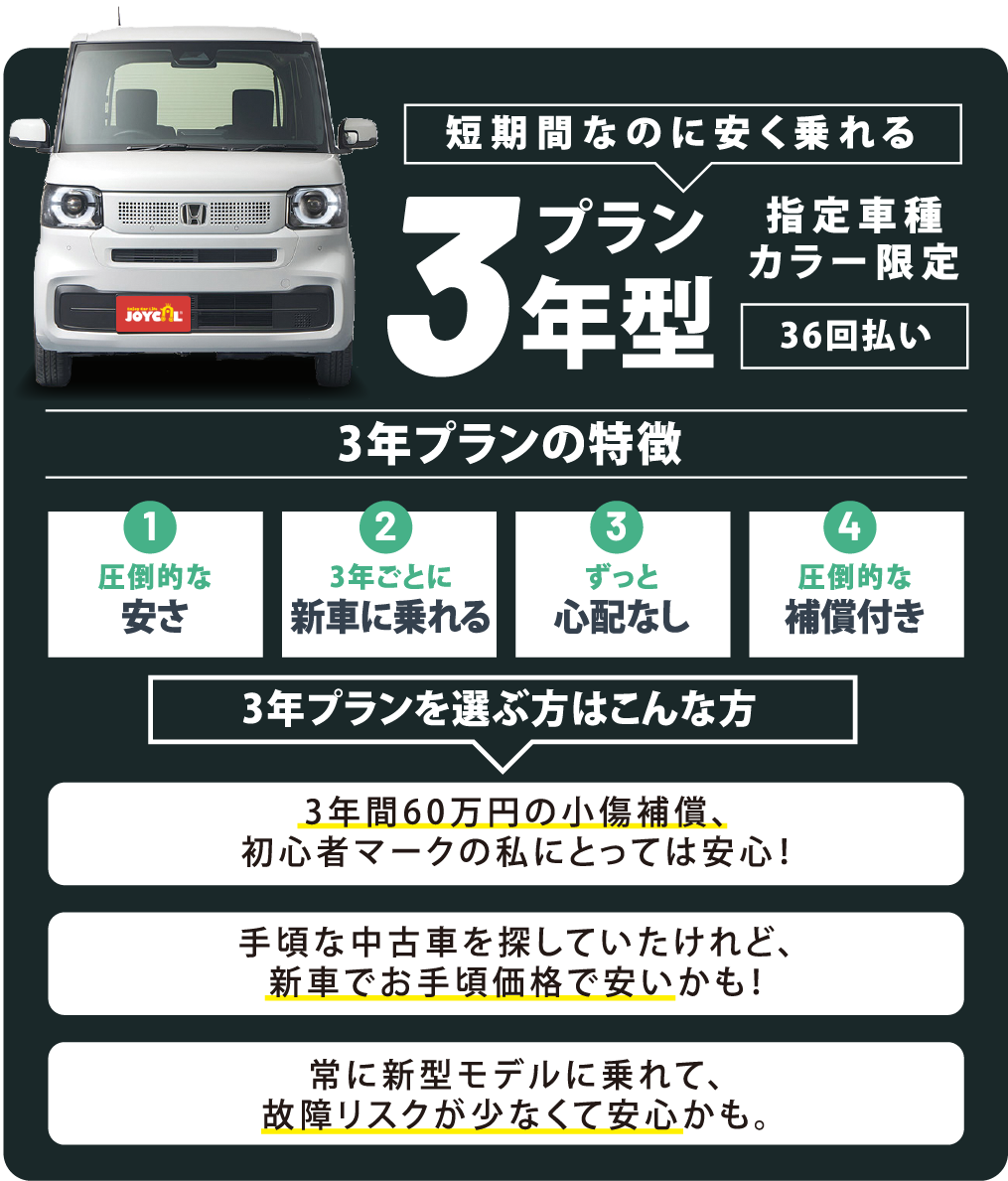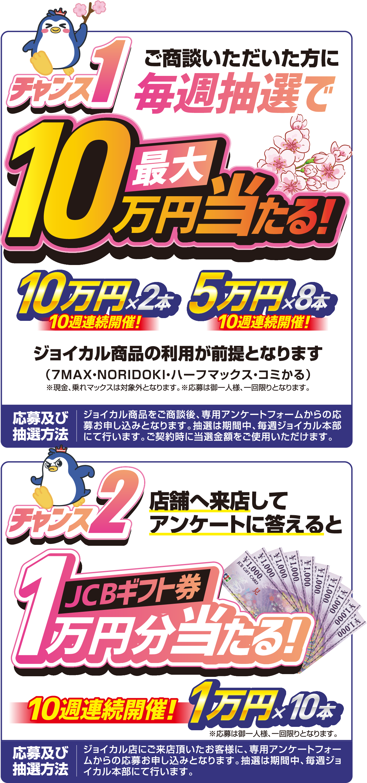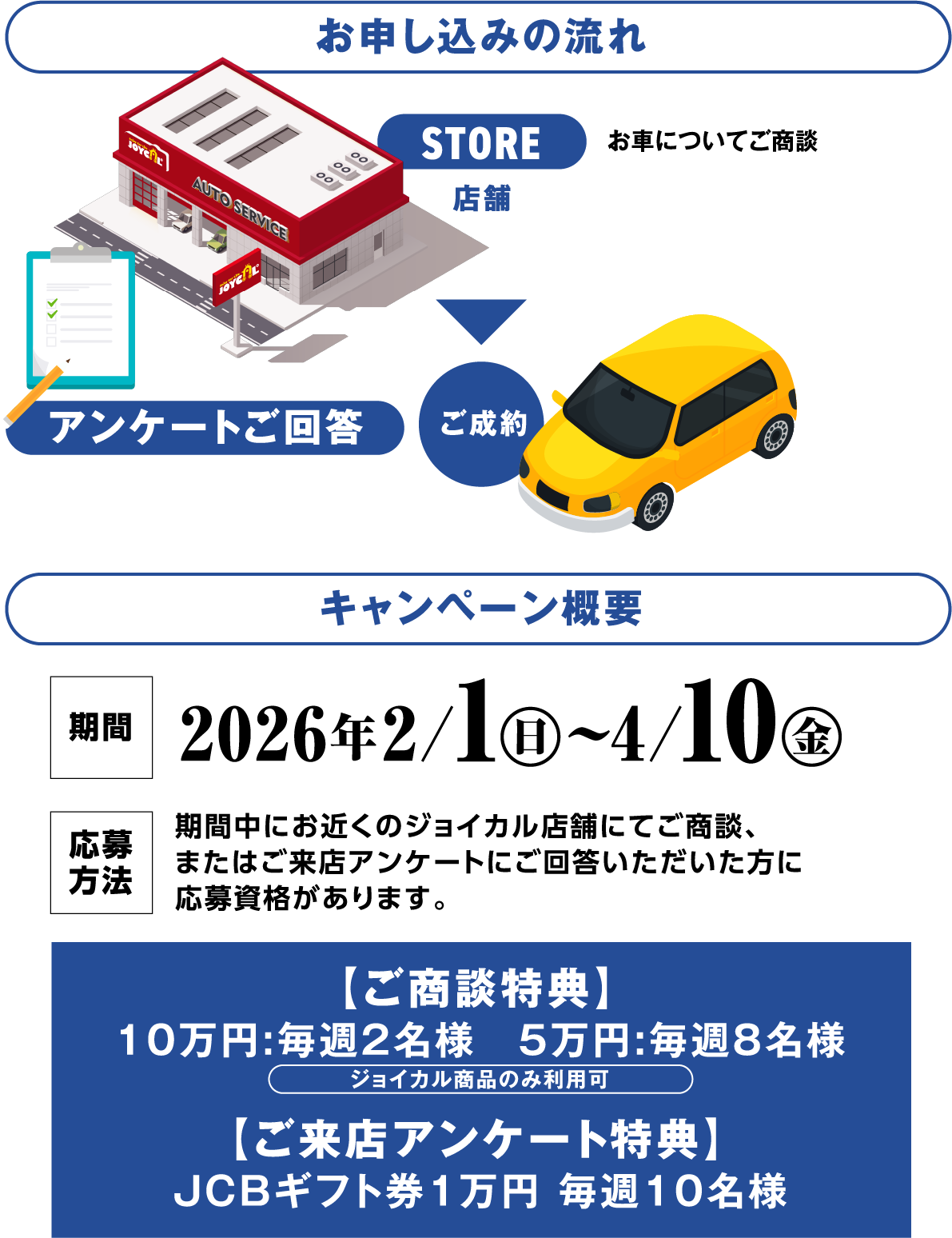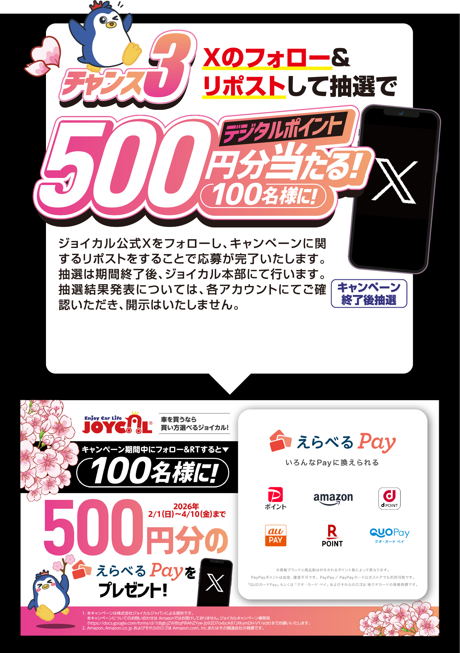 - ●新車購入時に付帯されたオプション品の代金の一部としてご利用になれます。●ご応募は期間中お一人様一回限りとさせていただきます。(複数応募は無効といたします)●ご応募に関して不正な行為があった場合、当選を取り消させていただく場合がございます。●本キャンペーンの適用は当選者ご本人が買主・登録名義人の場合に限ります。●ご当選者が普通自動車の運転可能な免許を保有していない場合、及び車庫証明の取得が出来ない場合は当選の権利は無効となります。●その他、当選後に弊社の定めた応募要件を満たしていないことが判明した場合は当選を取り消させていただく場合がございます。●当選の権利を金銭その他の物品と交換することはできません。また、第三者に当選権利を譲渡することもできません。関係者の応募はできません(社員・関連会社社員及びその親族)。●ジョイカルの店舗にて新車・中古車(全国産メーカー対象、一部輸入車を除く)購入時(セブンマックス・NORIDOKI・ハーフマックス・コミかるが対象)の代金の一部としてご利用になれます。●当選発表日以前にご成約済みの車両にさかのぼって適用することはできません。●弊社にて取得したお客様の「個人情報」は、車両販売・整備・保険事業における商品発送や関連のサービスの実施、又は、新車・サービスに関する情報やその他商品・サービス・イベントキャンペーンなどのお知らせの為に利用します。●その他、個人情報の取り扱いに関しては、 【個人情報保護方針】をご覧ください。